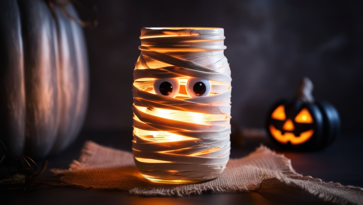 Halloween Tischdeko: Einmachglas umwickelt mit Mullbinden, mit Augen und Licht im Inneren, Mumien-Optik